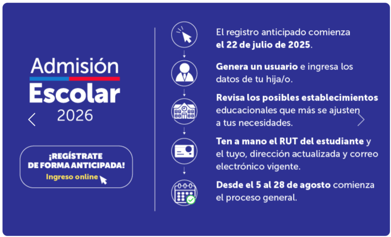 Tenemos el agrado de informar a ustedes que como parte de la reforma educacional, la Ley de Inclusión Escolar establece, entre otras cosas, el fin a la selección en los procesos de admisión a los establecimientos municipales, particulares subvencionados y de administración delegada del país, para que todas las niñas, niños y jóvenes tengan las mismas oportunidades de acceder a una educación de calidad, inclusiva y equitativa.